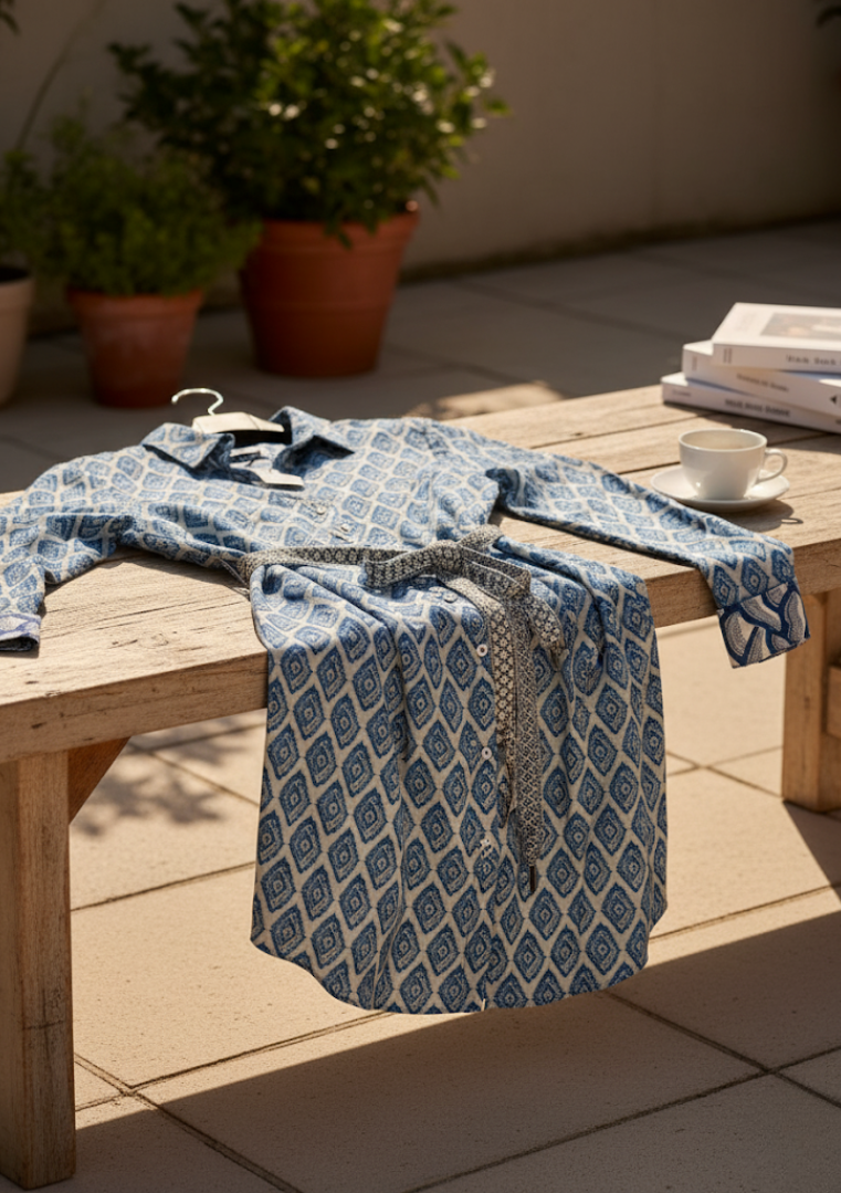 Robe chemise BRENDA en coton imprimé losange bleu à ceinture