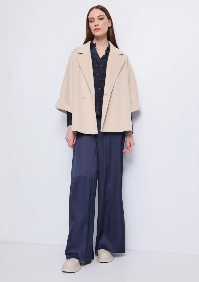 Pantalon palazzo en satin de viscose naturel, doté d’une taille élastique et de poches latérales. Sa coupe fluide et ample apporte confort et élégance en toute occasion.